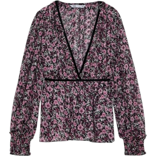 ZARA lila virágmintás V-nyakú peplum blúz