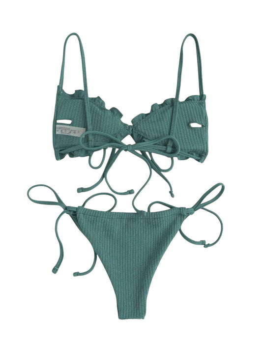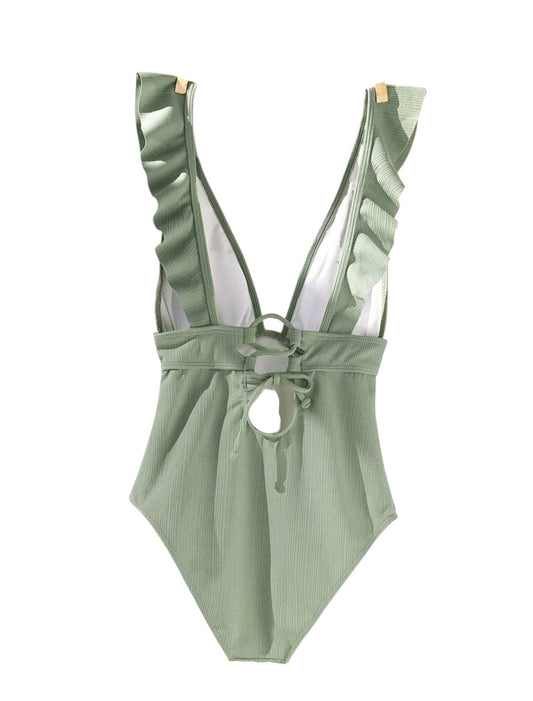 SHE olivazöld bordázott fodros V-nyakú egyrészes fürdőruha