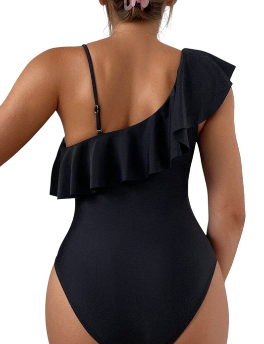 SHE fekete félvállas fodros hálós betétes egyrészes fürdőruha