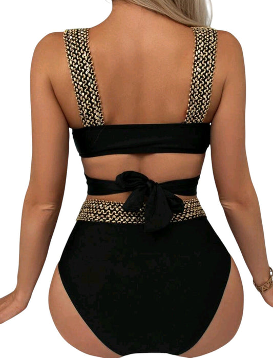 SHE fekete kontraszt szegélyes kivágott átlapolt bikini szett