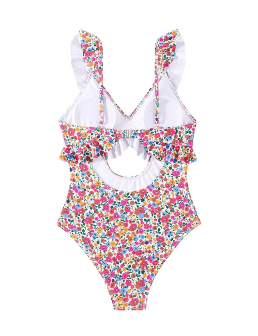 SHE fehér virágmintás fodros kivágott egyberészes fürdőruha