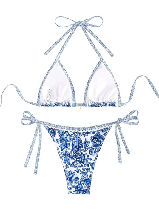 SHE fehér kék mintás csillogó szegélyes bikini szett
