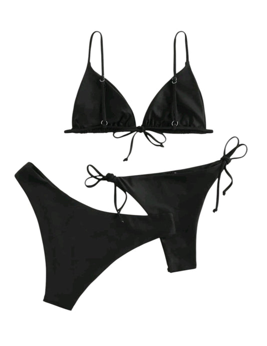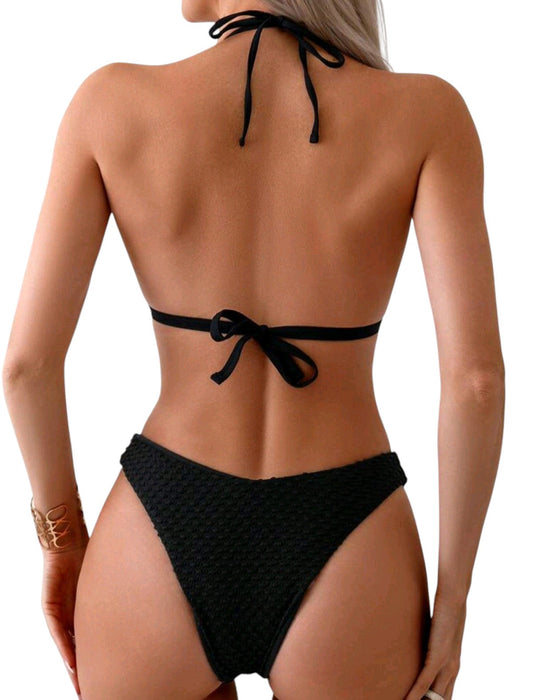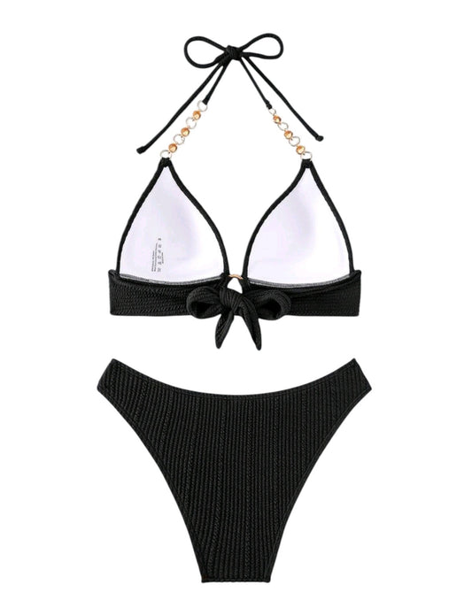 SHE fekete texturált karikás gyöngyös pántú bikini szett