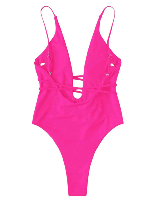 SHE élénk rózsaszín mély V-kivágású átkötős egyberészes fürdőruha
