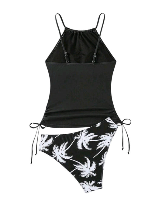 SHE fekete pálmafamintás tankini szett megkötős alsóval