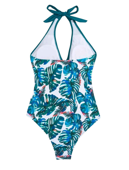 SHE sötét türkiz trópusi mintás magasderekú egyrészes fürdőruha