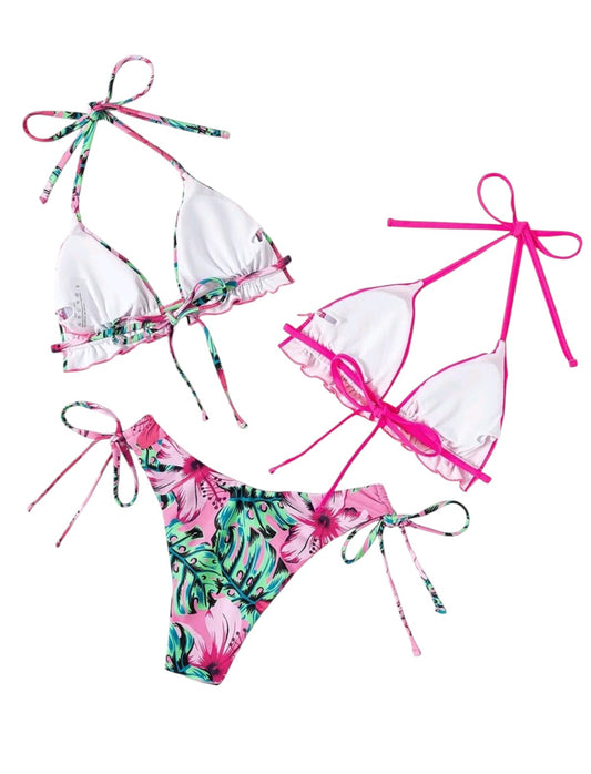 SHE rózsaszín virágmintás megkötős kétrészes bikini szett