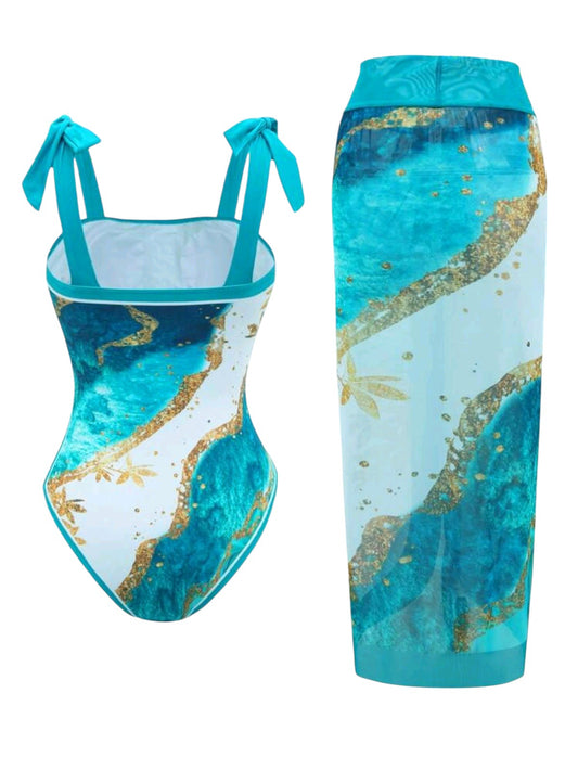 SHE türkiz márványmintás egyrészes fürdőruha szett pareóval