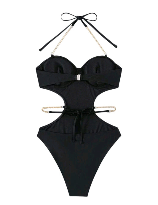 SHE fekete aranyláncos kivágott egyrészes fürdőruha