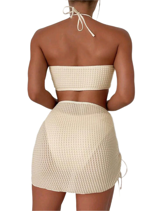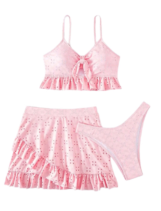SHE rózsaszín fodros masnis háromrészes fürdőruha szett