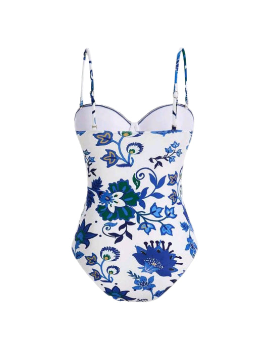 SHE fehér kék mintás egyberészes fürdőruha szoknyával