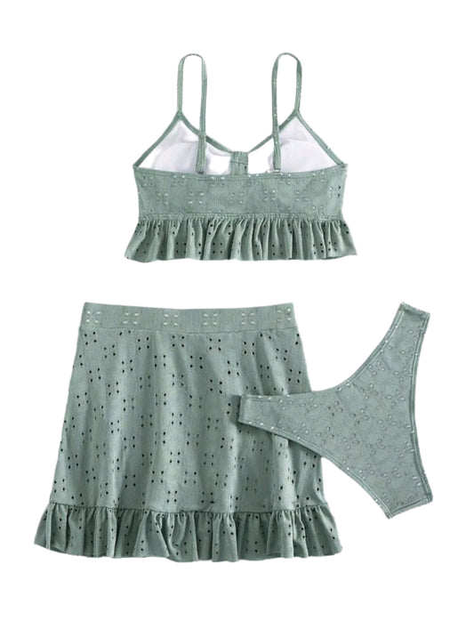 SHE zöld hímzett fodros háromrészes fürdőruha szett