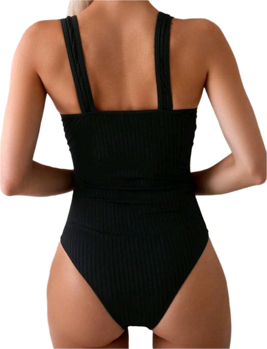 SHE fekete kontrasztos pántos egyberészes fürdőruha