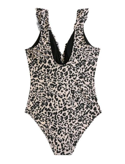 SHE bézs-fekete leopárdmintás fodros egyrészes fürdőruha
