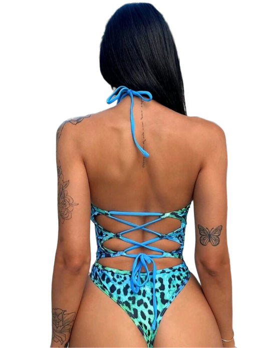 SHE kék-zöld állatmintás cut-out fürdőruha