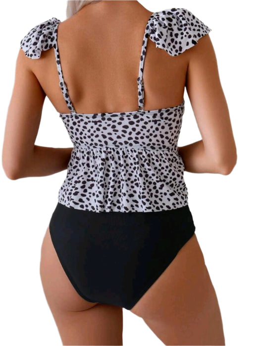 SHE fehér-fekete pöttyös fodros tankini fürdőruha