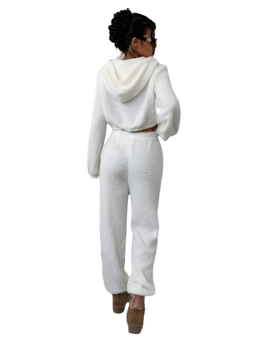 SHE fehér plüss kapucnis pulóver és nadrág szett