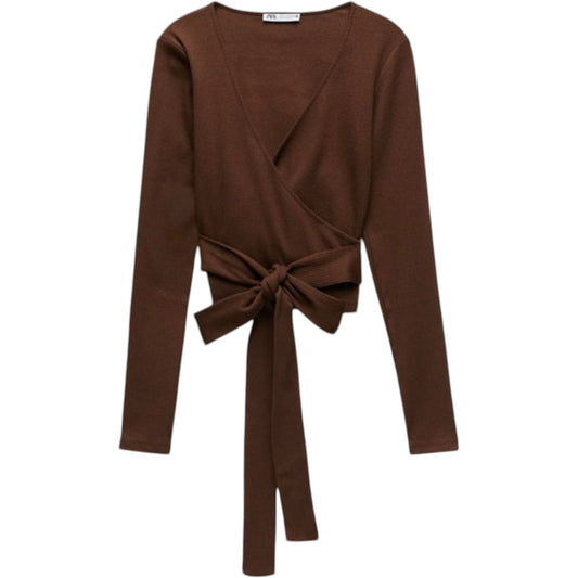 ZARA barna kötött átlapolt hosszú ujjú pulóver