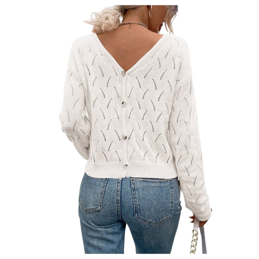 SHE ekrü V-nyakú lyukacsos kötött pulóver