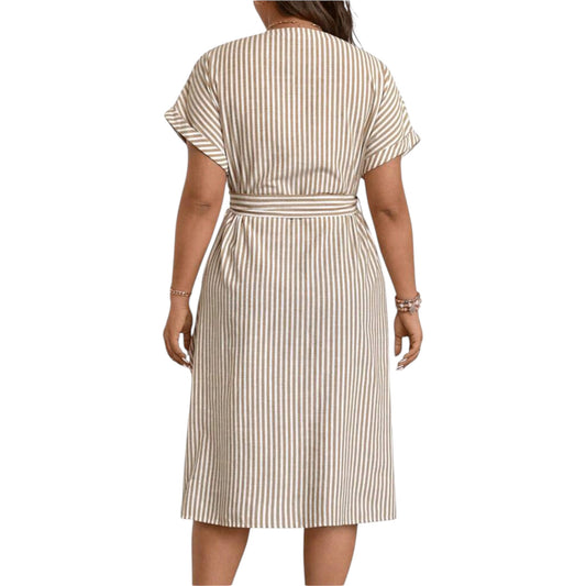 SHE bézs és fehér csíkos midi ingruha övvel