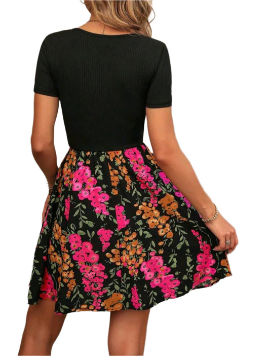 SHE fekete felsőrésszel és élénk virágmintás szoknyával ellátott mini ruha