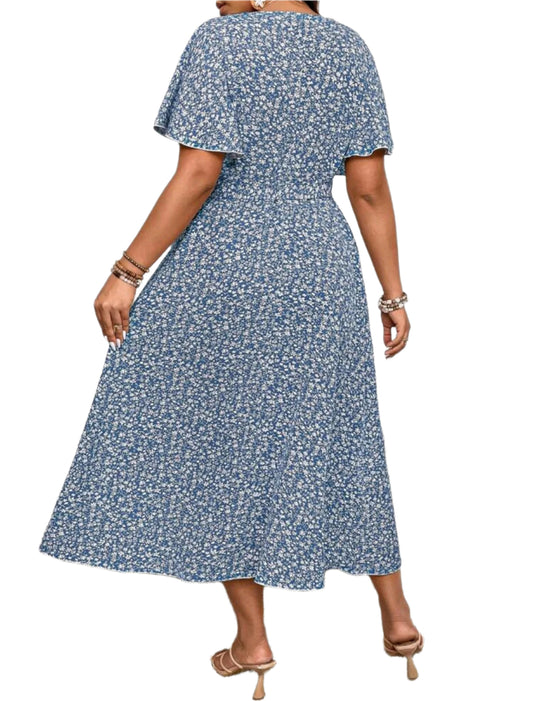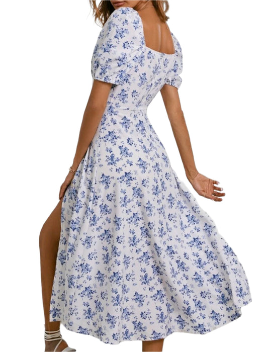 SHE fehér kék virágmintás felsliccelt nyári ruha