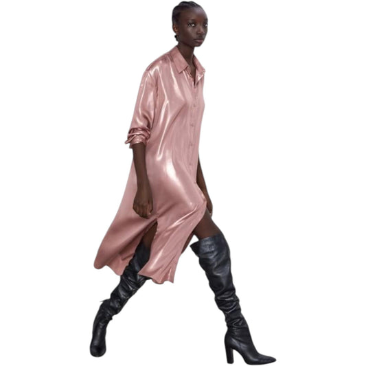 ZARA rózsaszín fényes hosszú ujjú midi ingruha