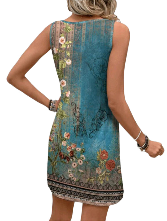 SHE kék vintage virágmintás ujjatlan mini ruha