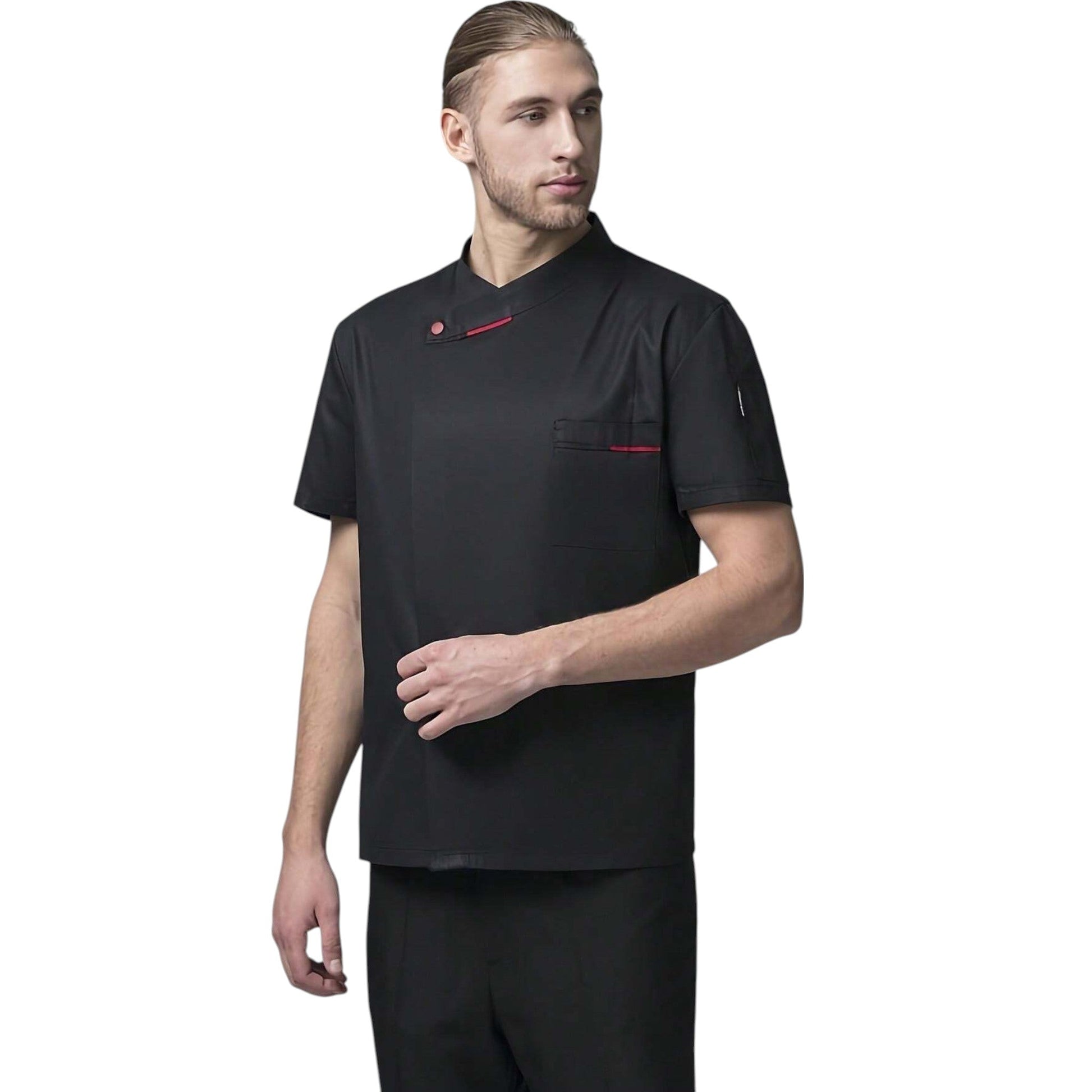 Címke nélküli, fekete, rövid ujjú, állógalléros, patentos, piros díszítéssel.