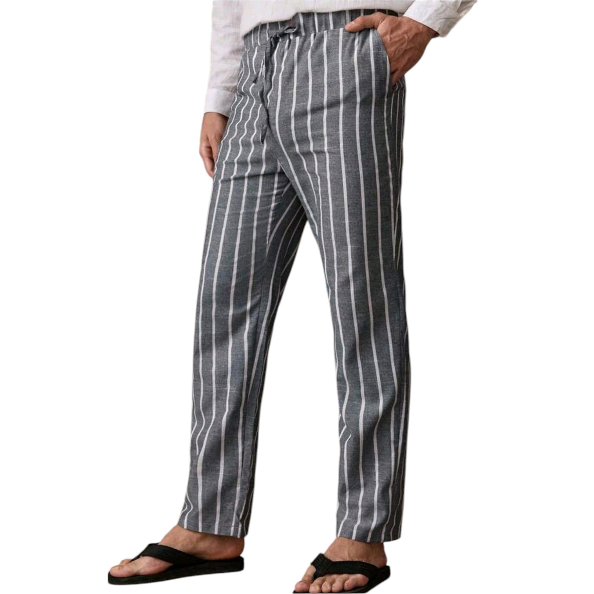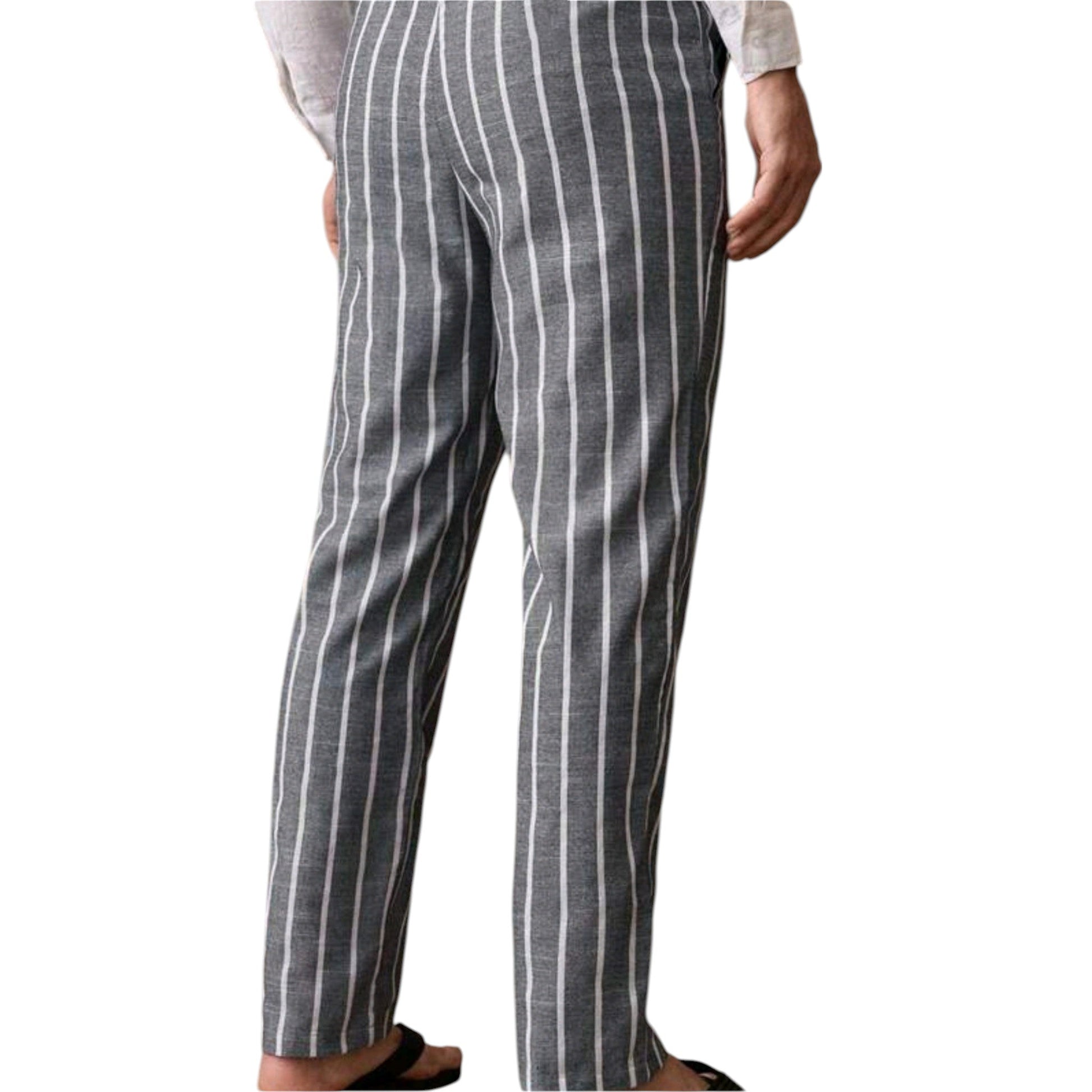 Címke nélküli, szürke, fehér csíkos, egyenes szárú, húzózsinóros derekú nadrág.