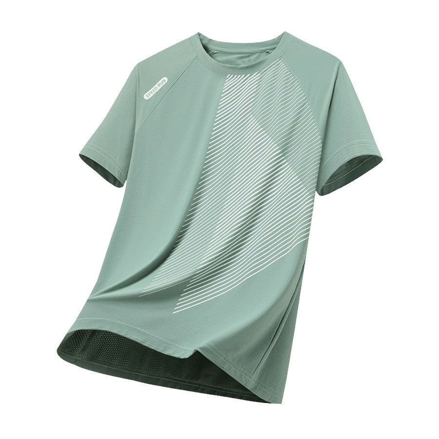 Címke nélküli, világoszöld alapon fehér vonalmintás, kerek nyakú, rövid ujjú sport póló "SPEED RUN" felirattal