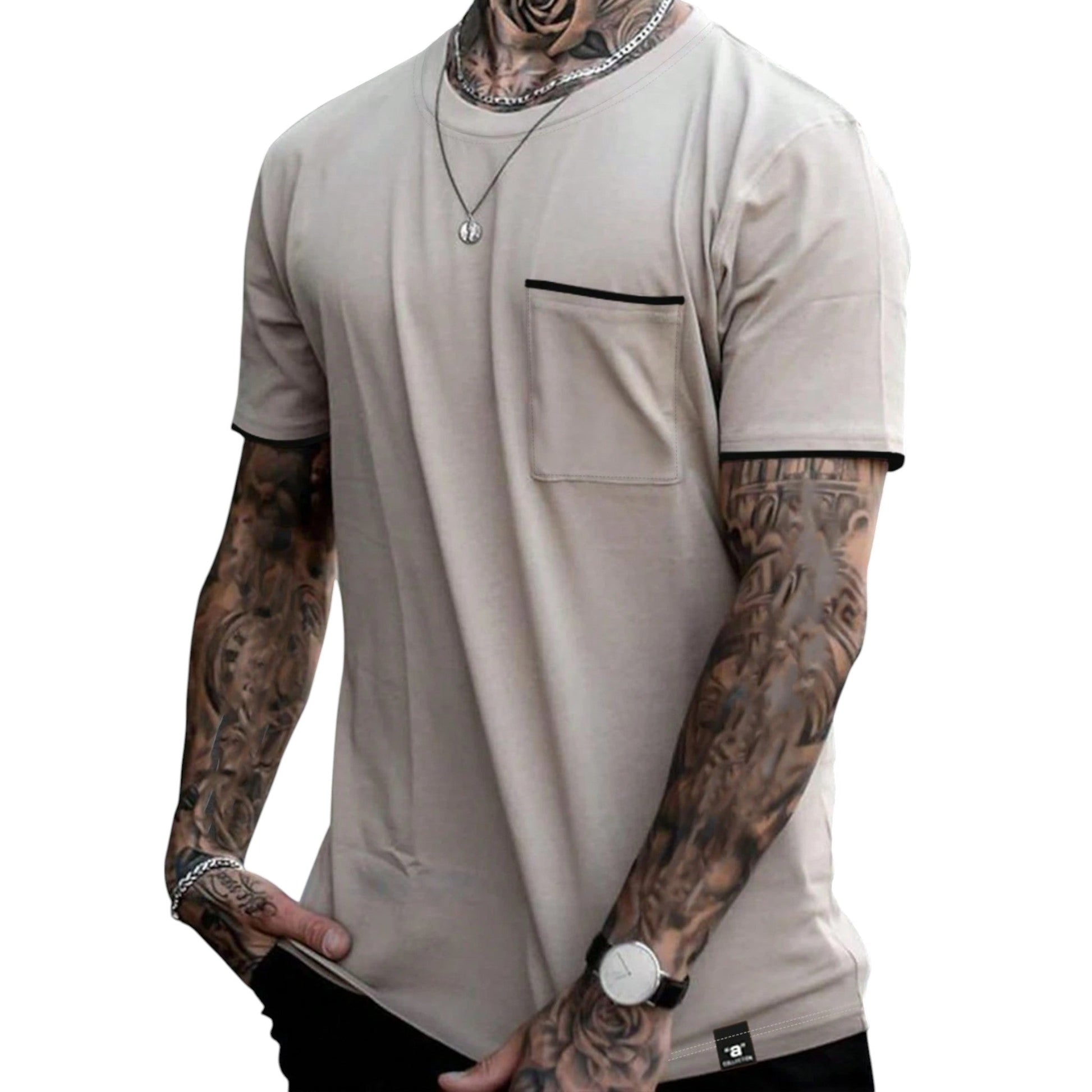 Címke nélküli, bézs, rövid ujjú, kerek nyakú, mellzsebbel, fekete szegéllyel.