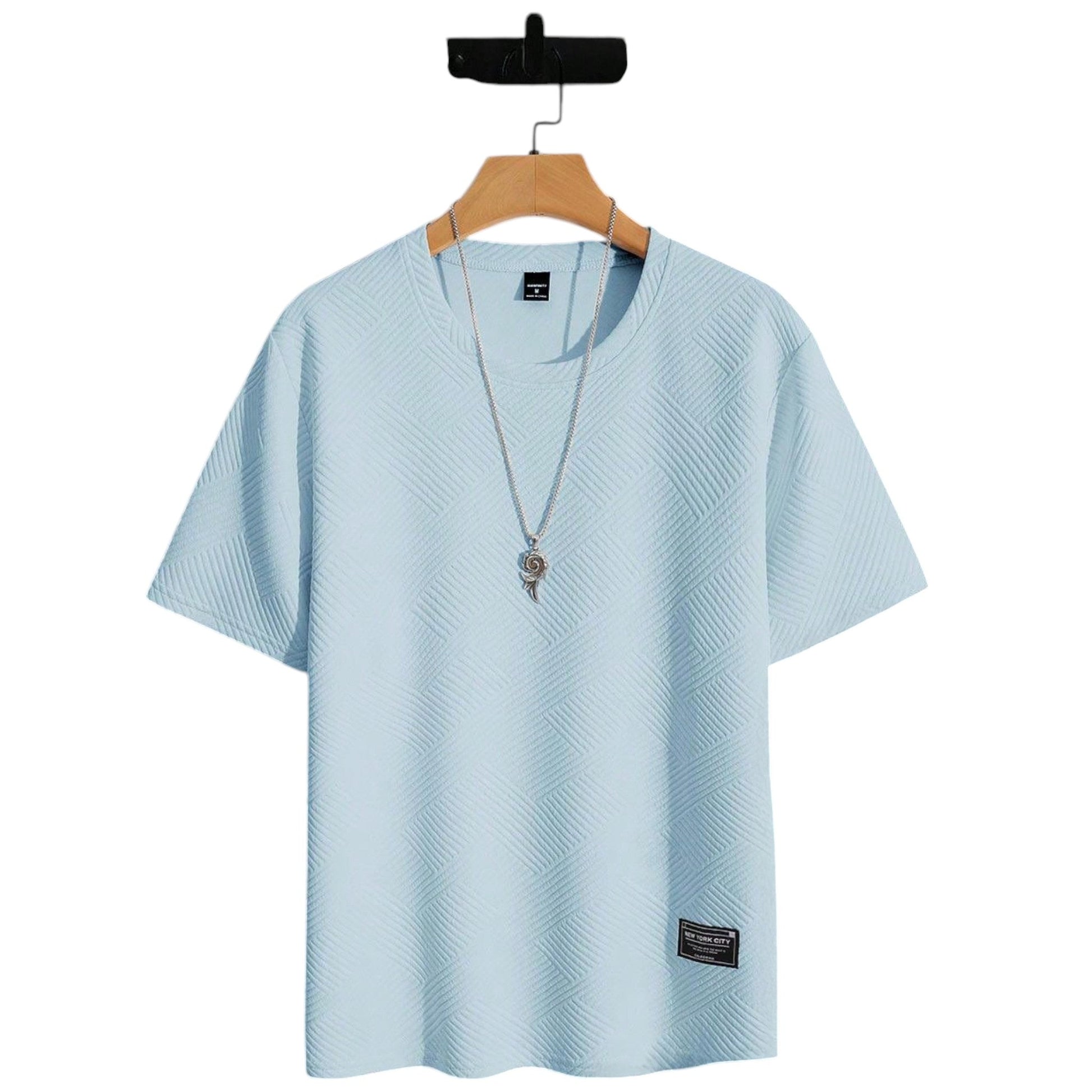 Címke nélküli, világoskék, texturált anyagú, rövid ujjú, kerek nyakú póló.