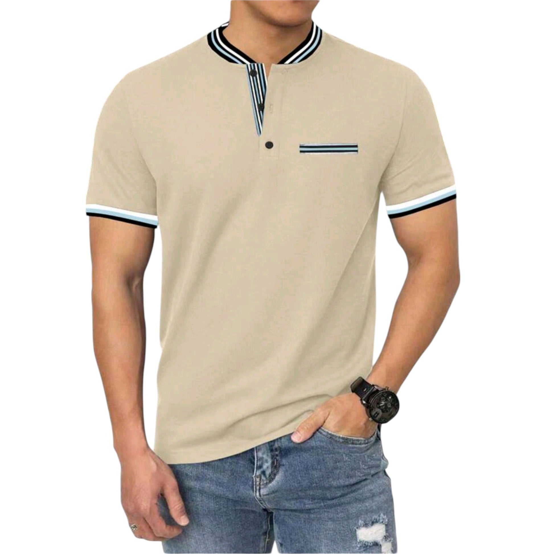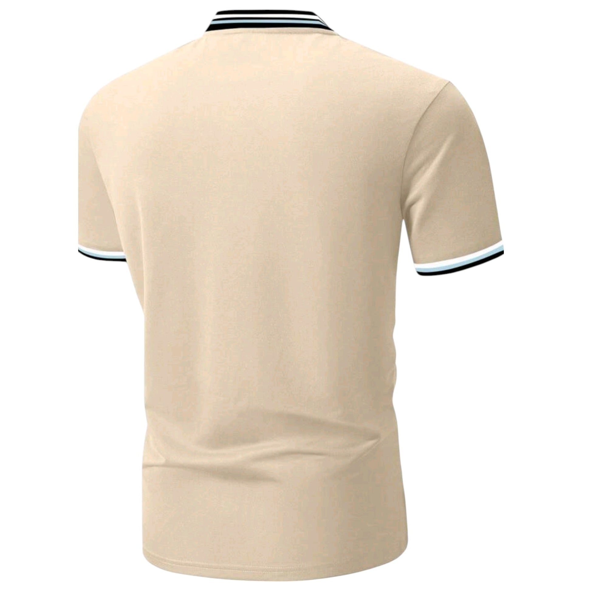 Címke nélküli, bézs, rövid ujjú, csíkos gallér és ujjvégek, gombolós nyakkivágás, mellzseb
