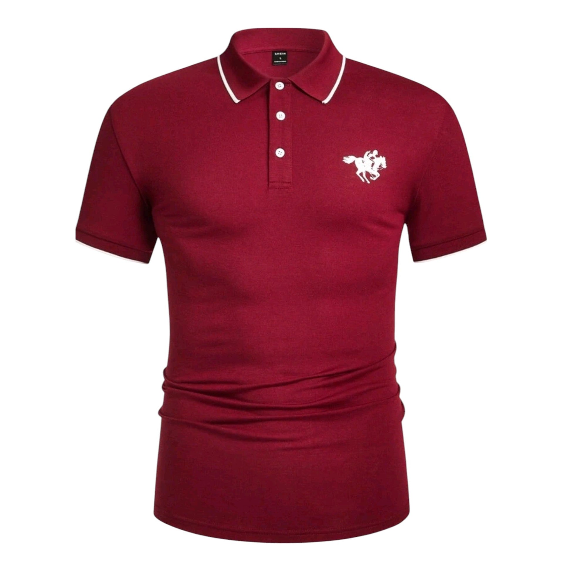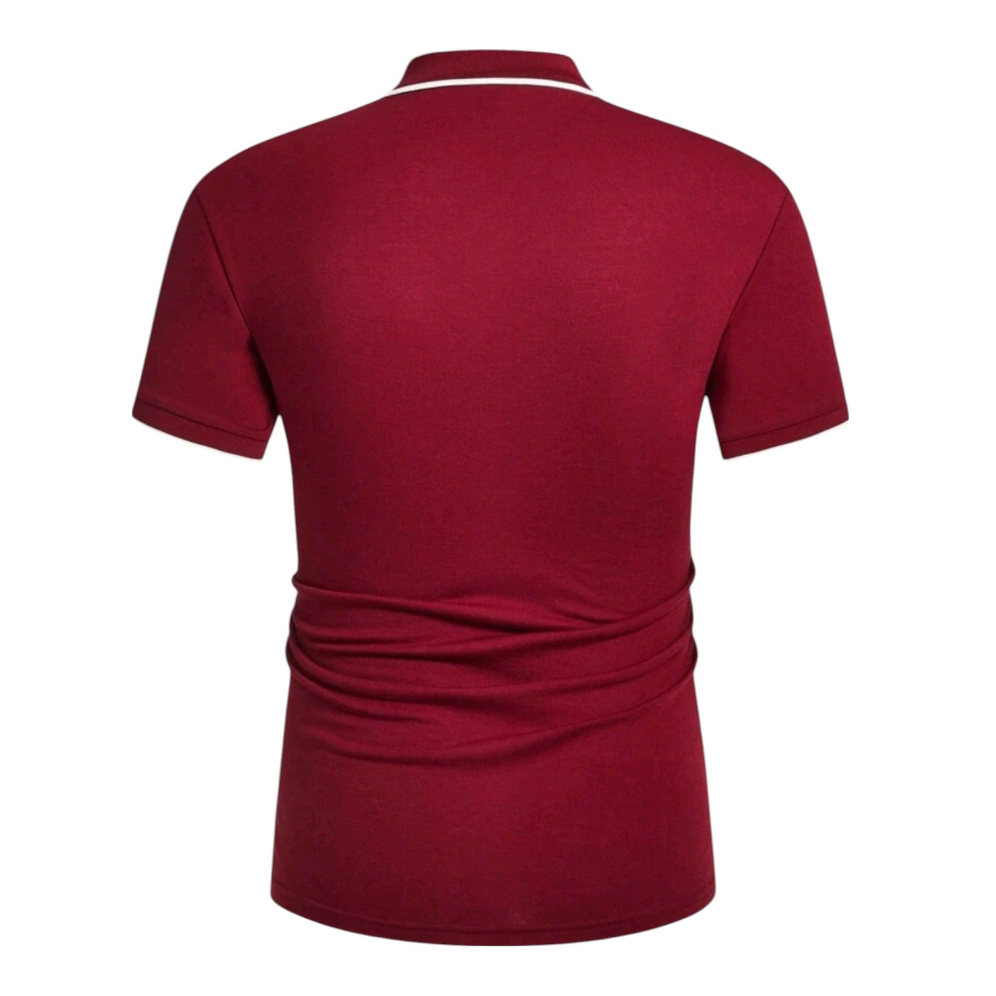 Címke nélküli, bordó, rövid ujjú, fehér szegélyes gallér, gombok, hímzett logóval