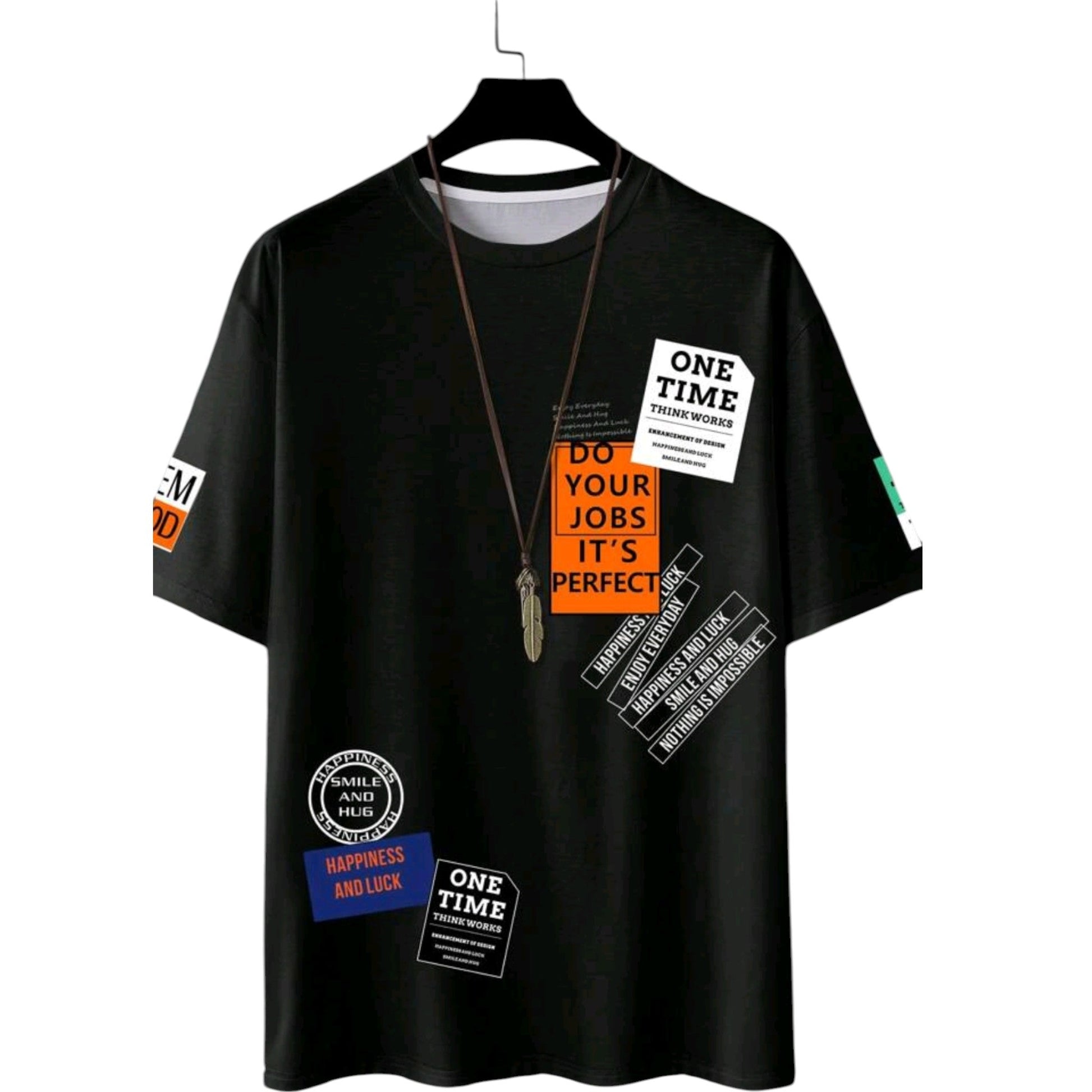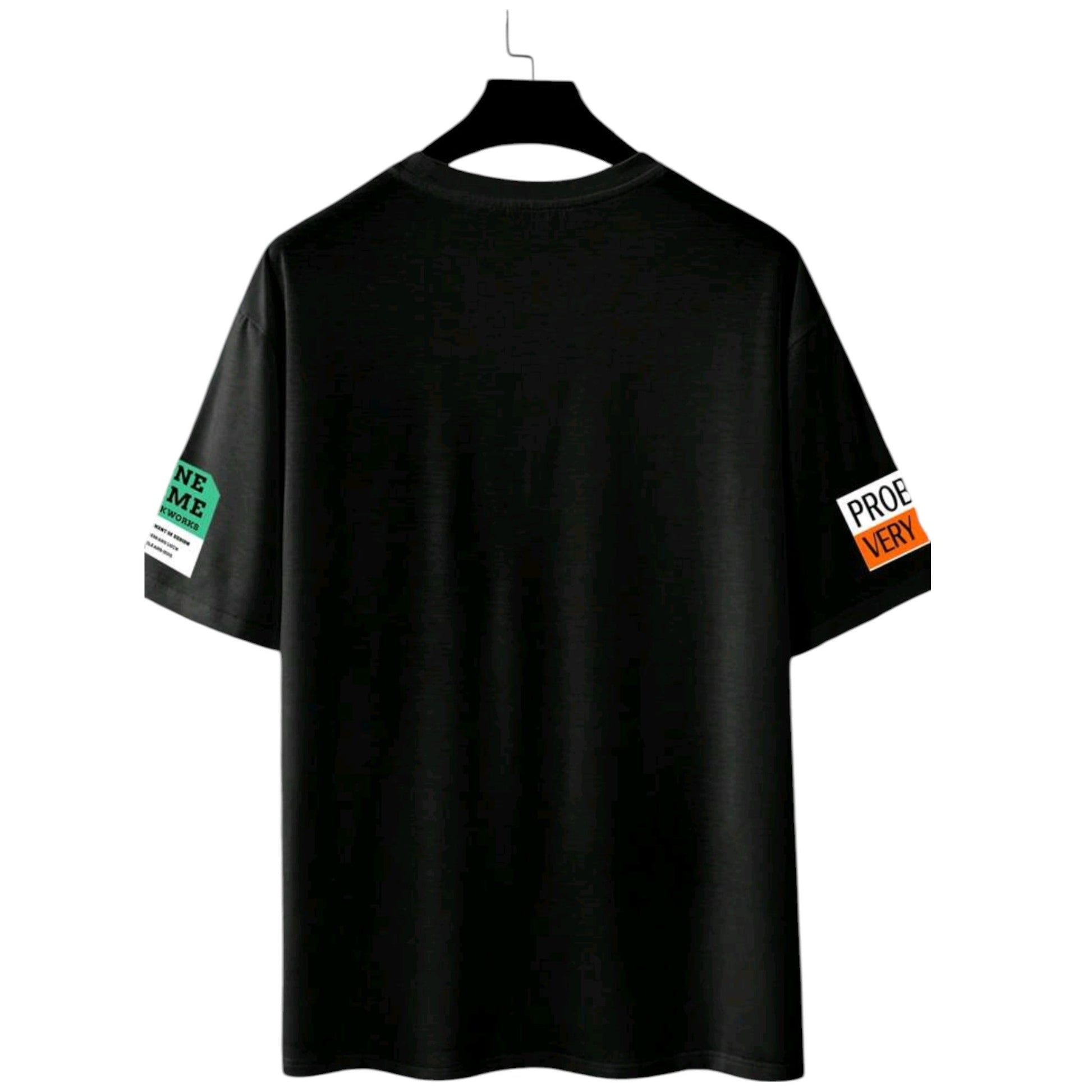 Címke nélküli, fekete, rövid ujjú, matricás/feliratos mintával elöl