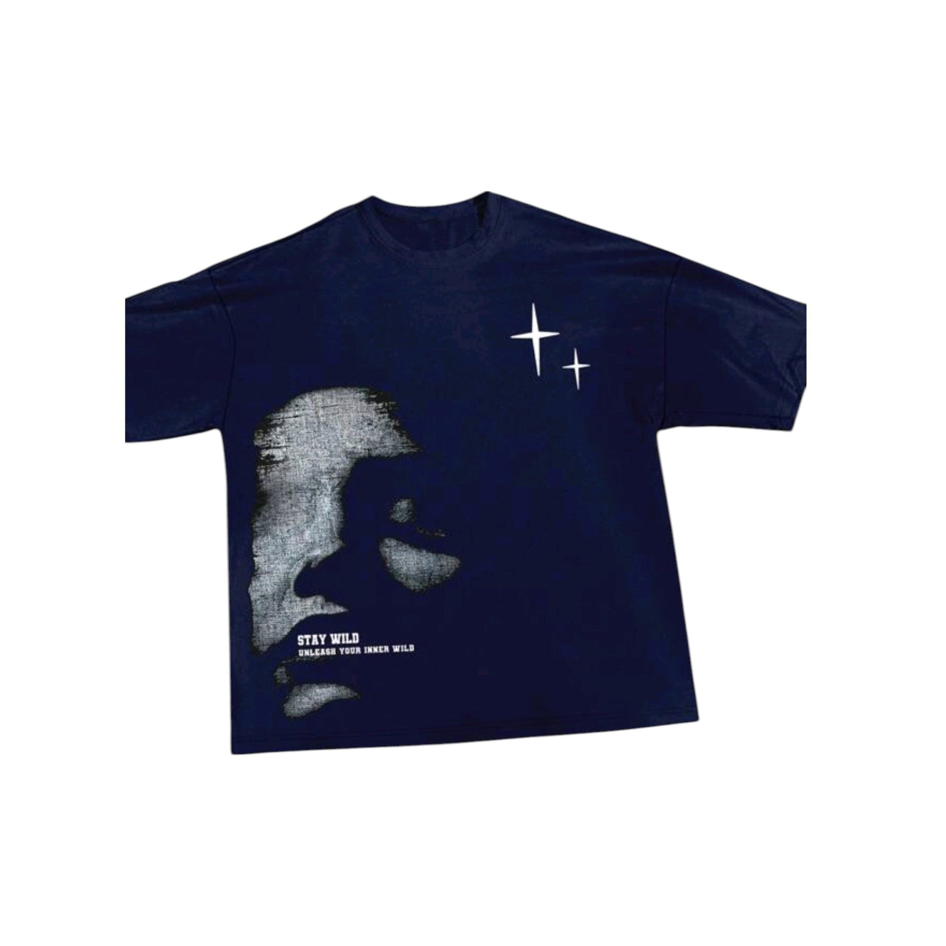Címke nélküli, sötétkék, rövid ujjú, grafikus mintával elöl