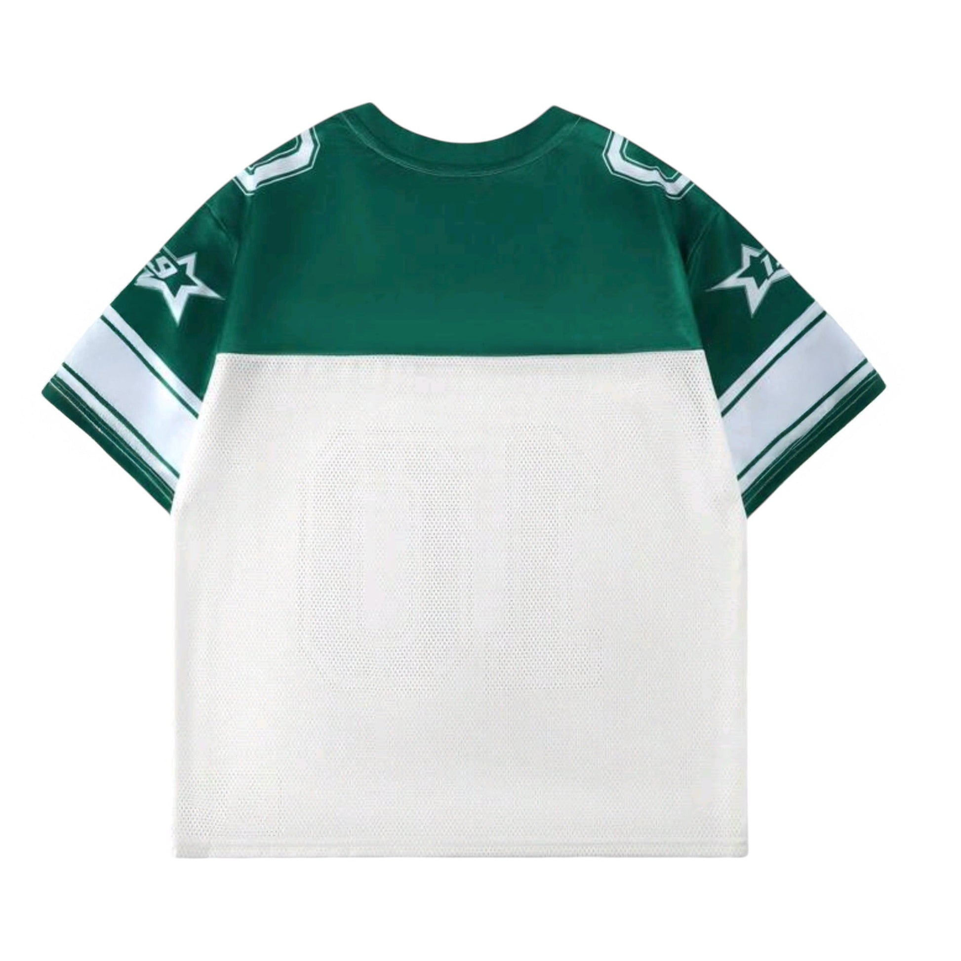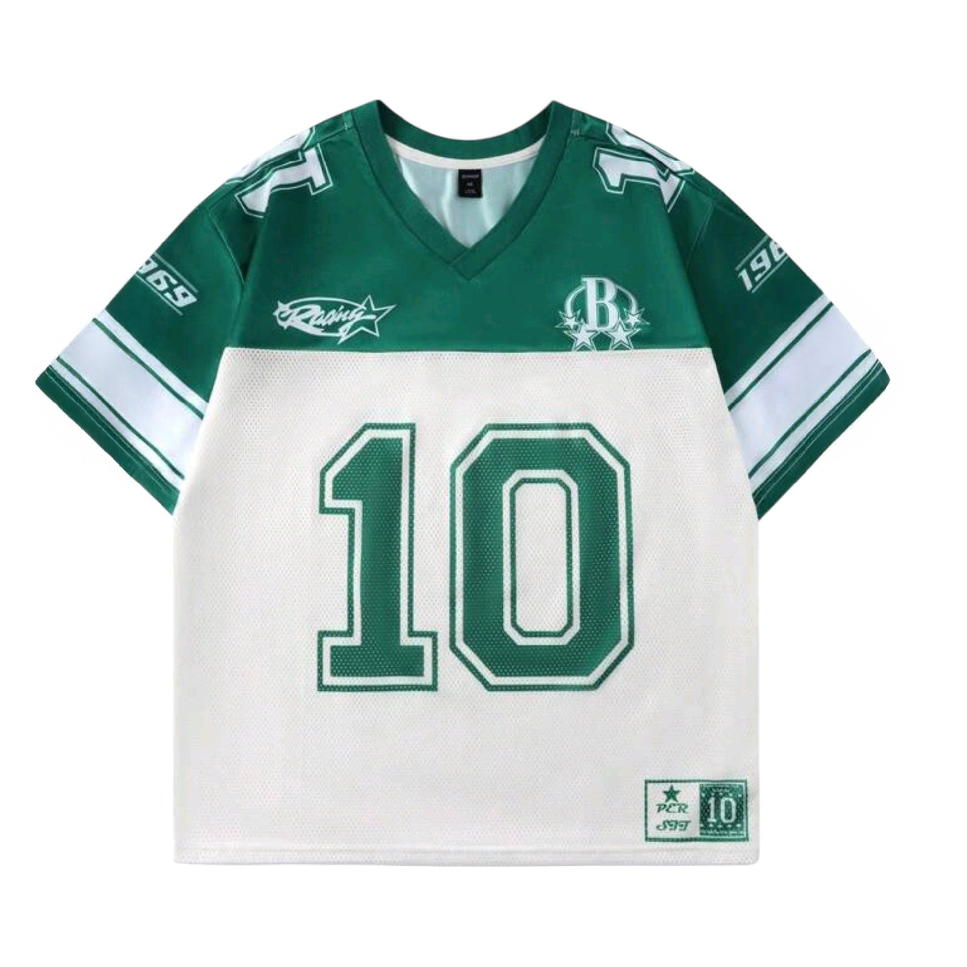 Címke nélküli, zöld és fehér, rövid ujjú, sportos design, V-nyakú, számozással elöl