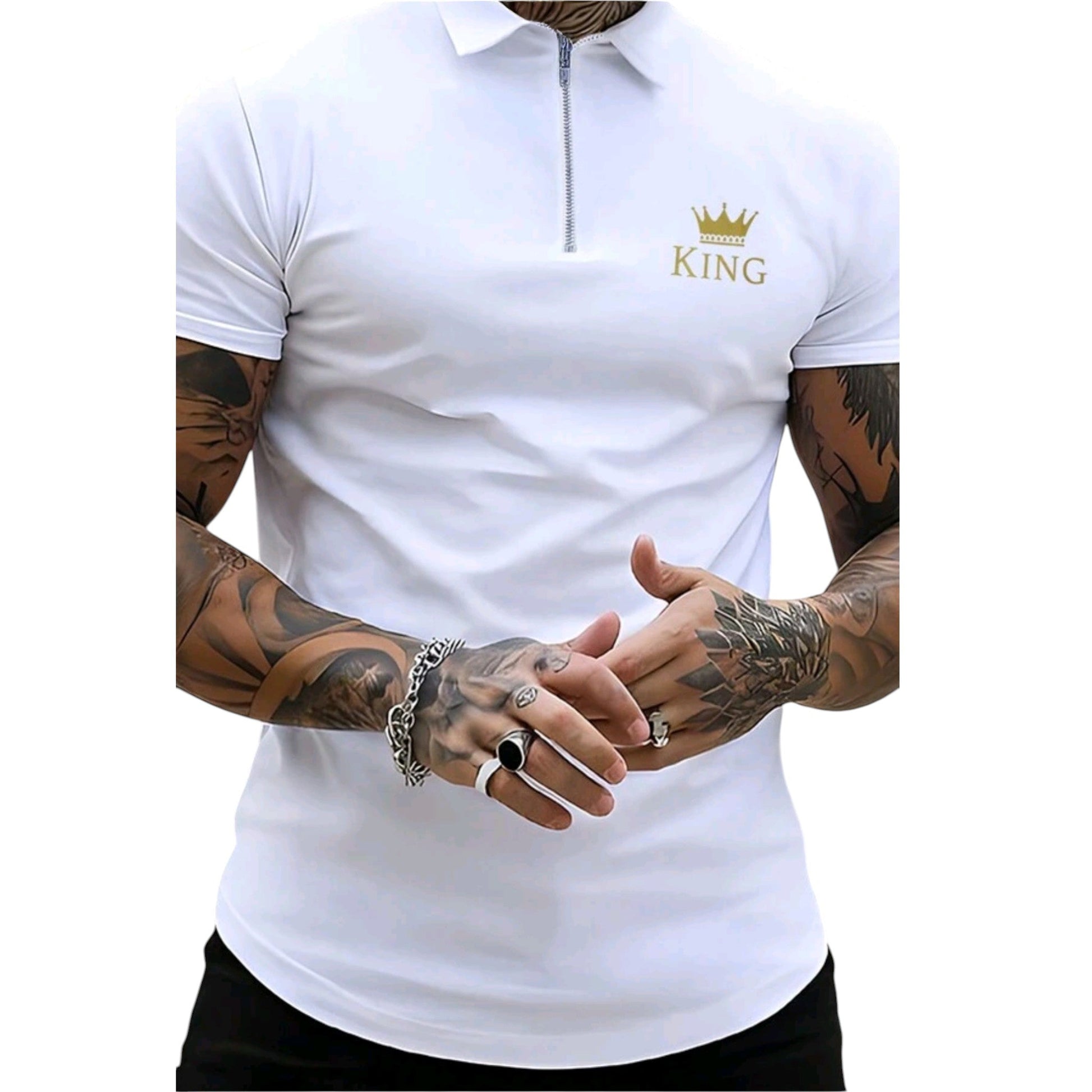 Címke nélküli, fehér, rövid ujjú, galléros, cipzáras nyakkivágással, koronás és "KING" feliratos mintával