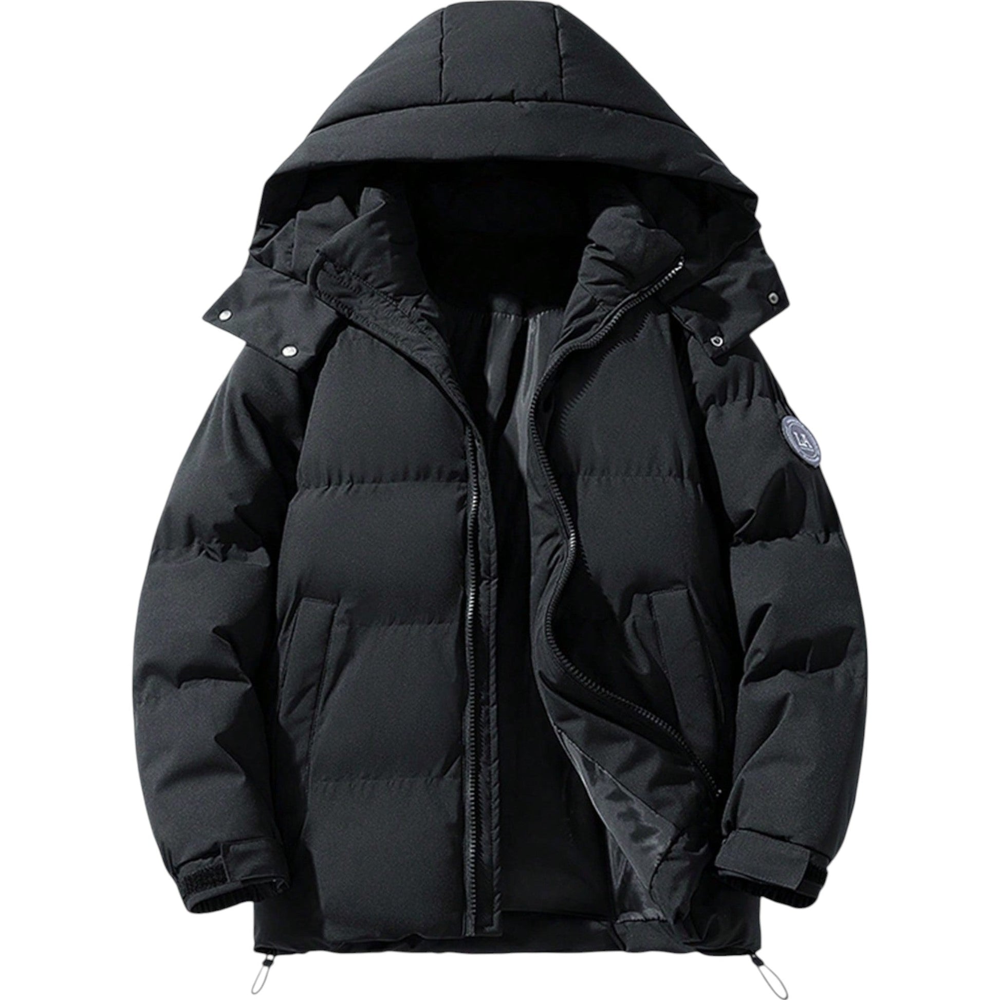 Címke nélküli, fekete színű, kapucnis, cipzáras, bélelt téli kabát. A kabát zsebekkel rendelkezik, és húzózsinórral állítható az alja. Meleg és kényelmes viselet a hideg napokra.