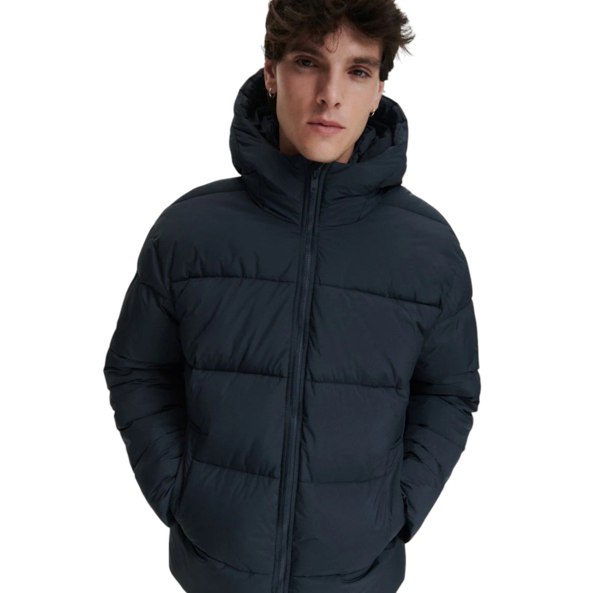 Címke nélküli, sötétkék, hosszú ujjú, kapucnis, steppelt, elöl cipzáros, két oldalsó zsebbel.