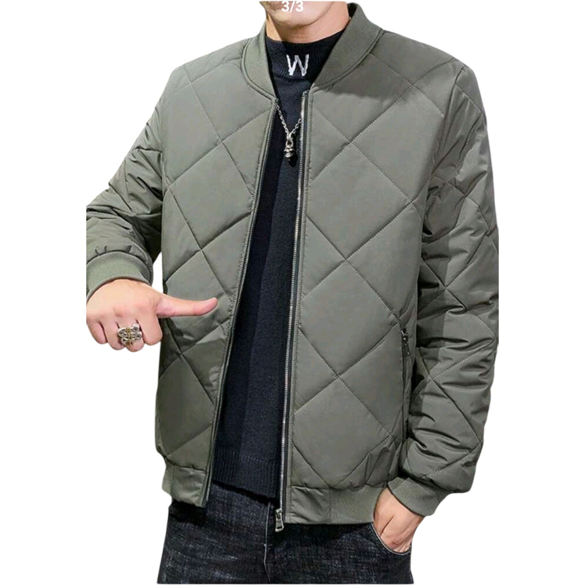 Címke nélküli, szürke, rombusz mintában steppelt, cipzáras bomber dzseki, álló gallérral, bordázott passzéval az ujjvégen és alján.