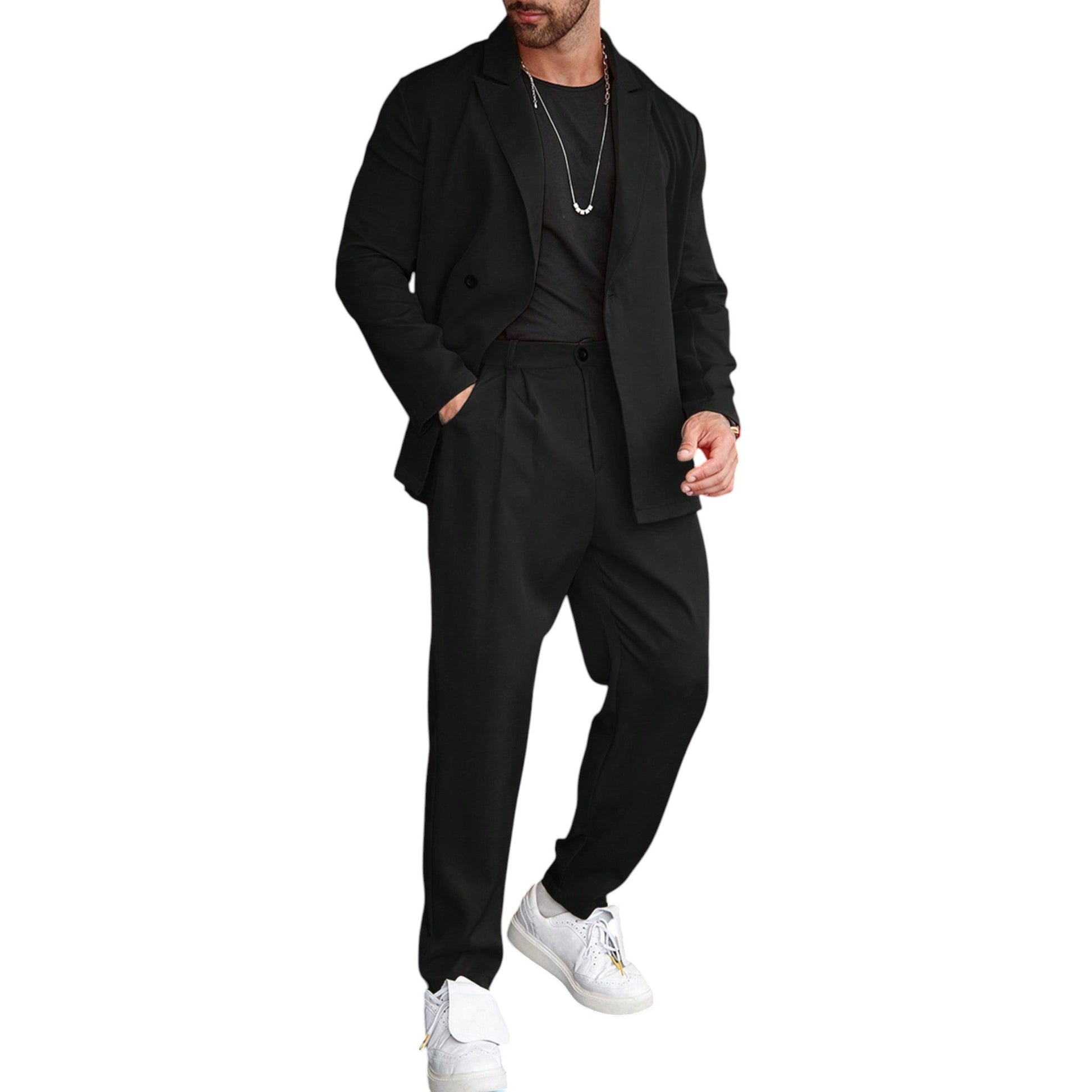 Címke nélküli, fekete, laza szabású zakó és nadrág.