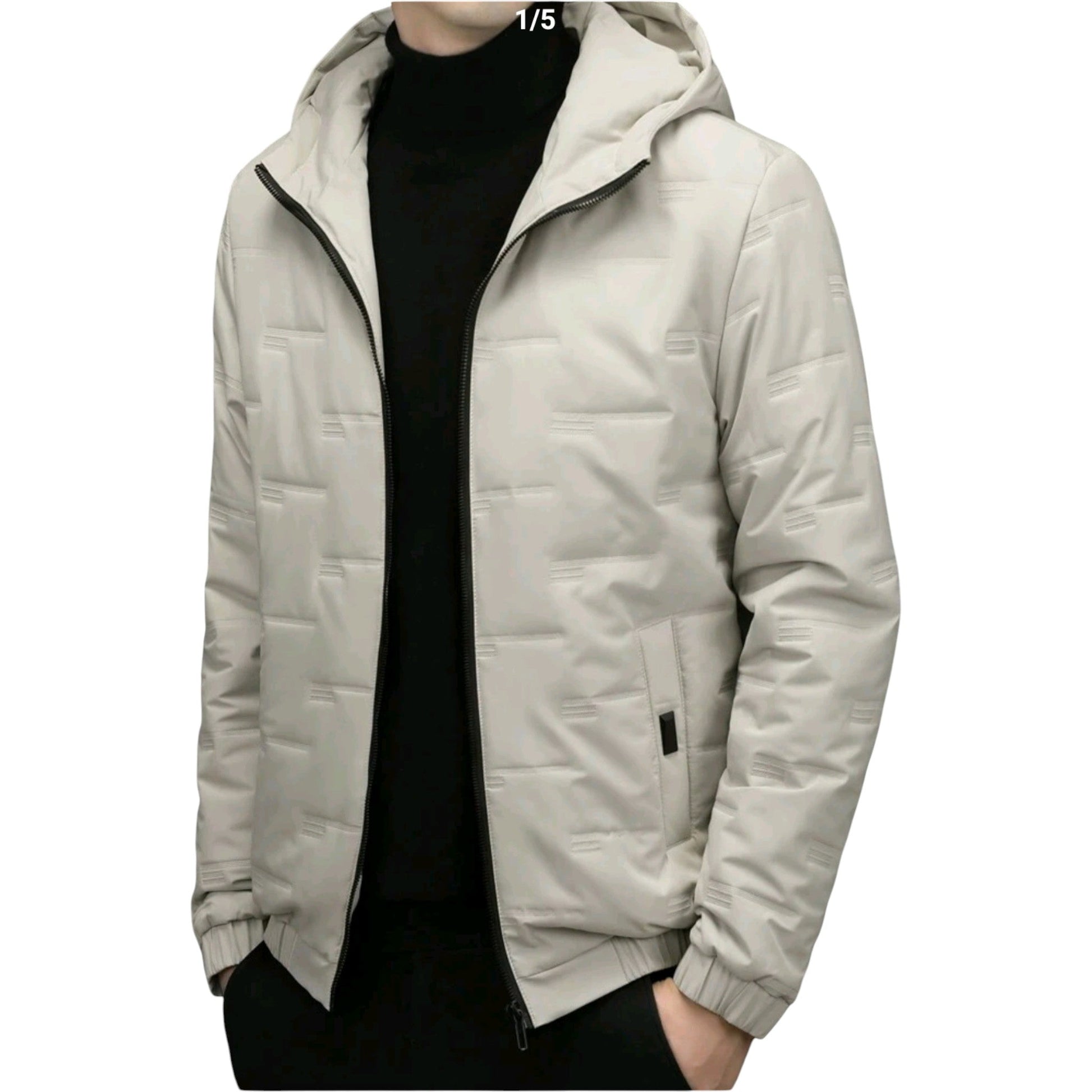 Címke nélküli, világosszürke, steppelt dzseki, vízszintes mintás steppeléssel, kapucnival, cipzárral és passzéval az ujjvégen és alján.