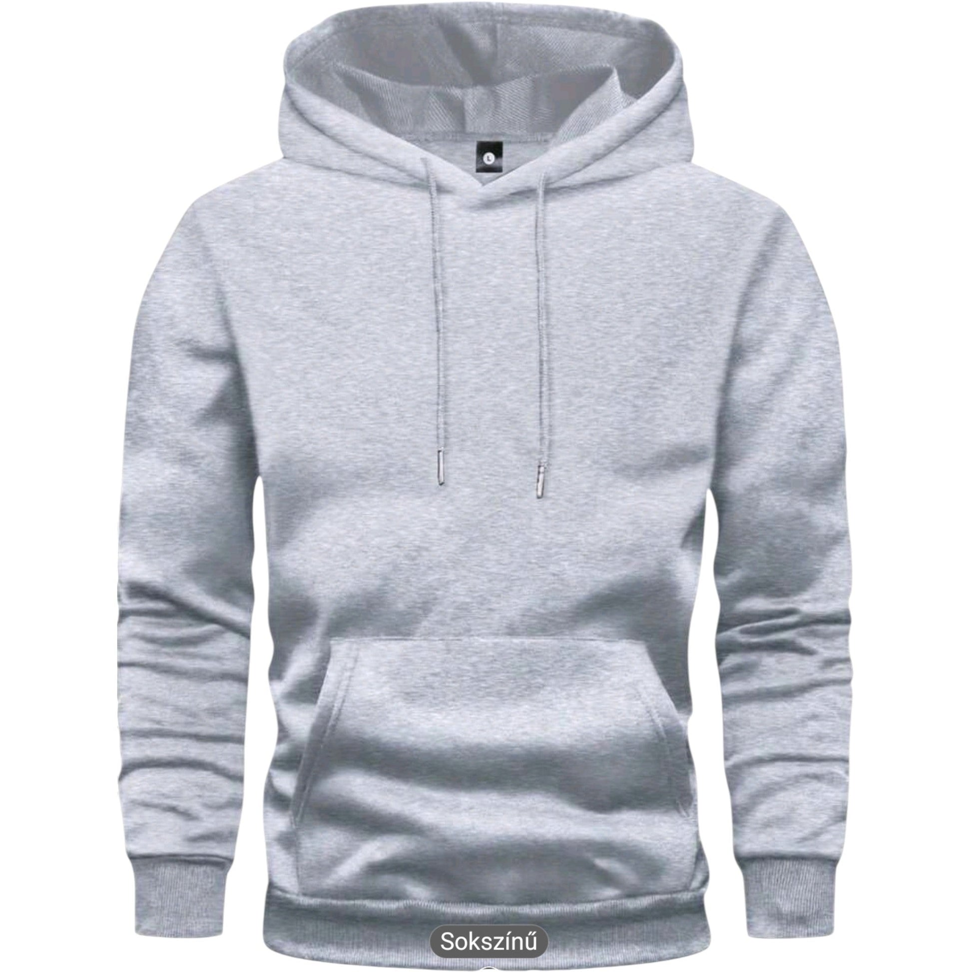 Címke nélküli, szürke melírozott, kapucnis pulóver, állítható húzózsinórral, kenguruzsebbel és bordázott passzéval az ujjvégen és alján.