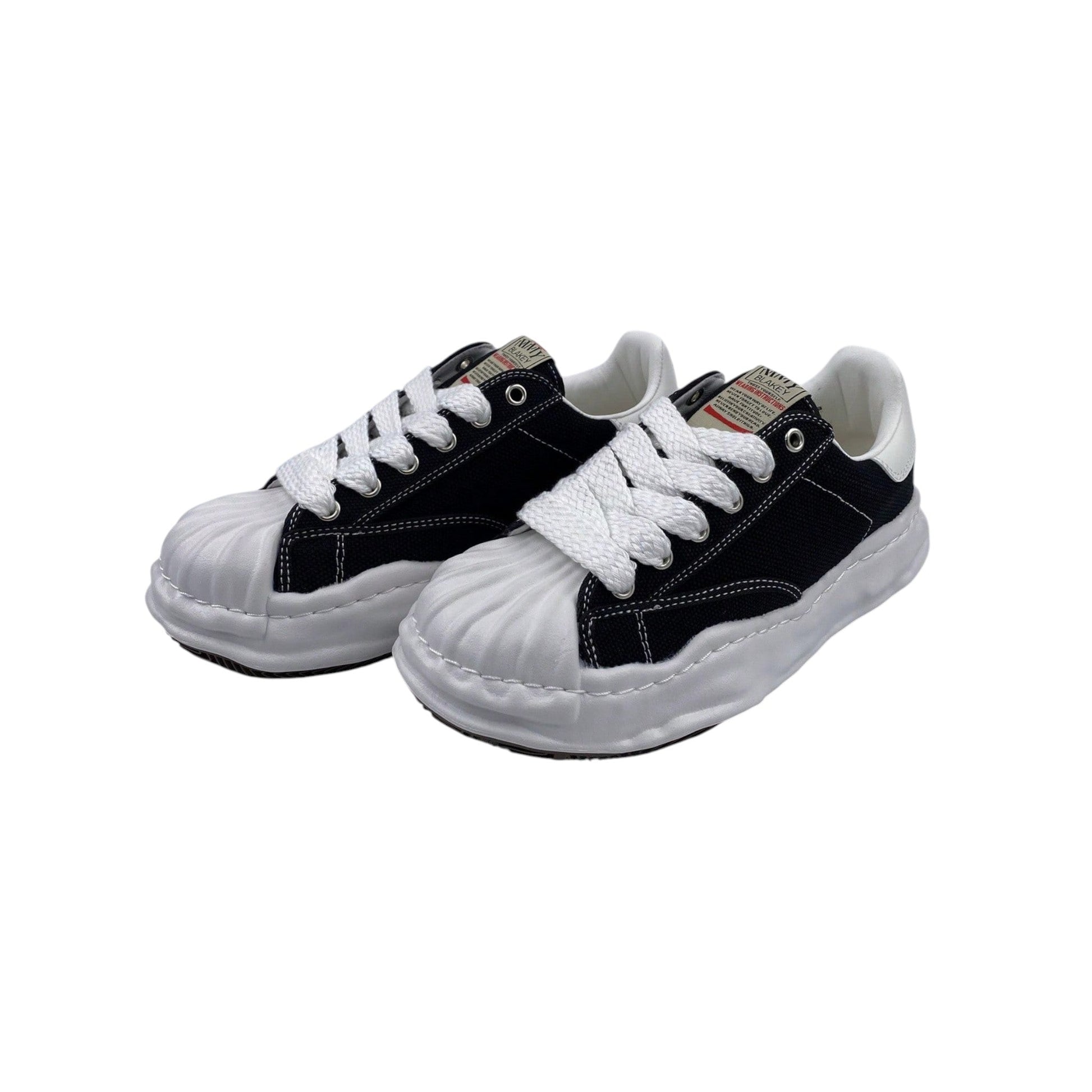 Címke nélküli, fekete és fehér, vászon anyagú, fűzős sportcipő, vastag platform talppal, kagylóorral.