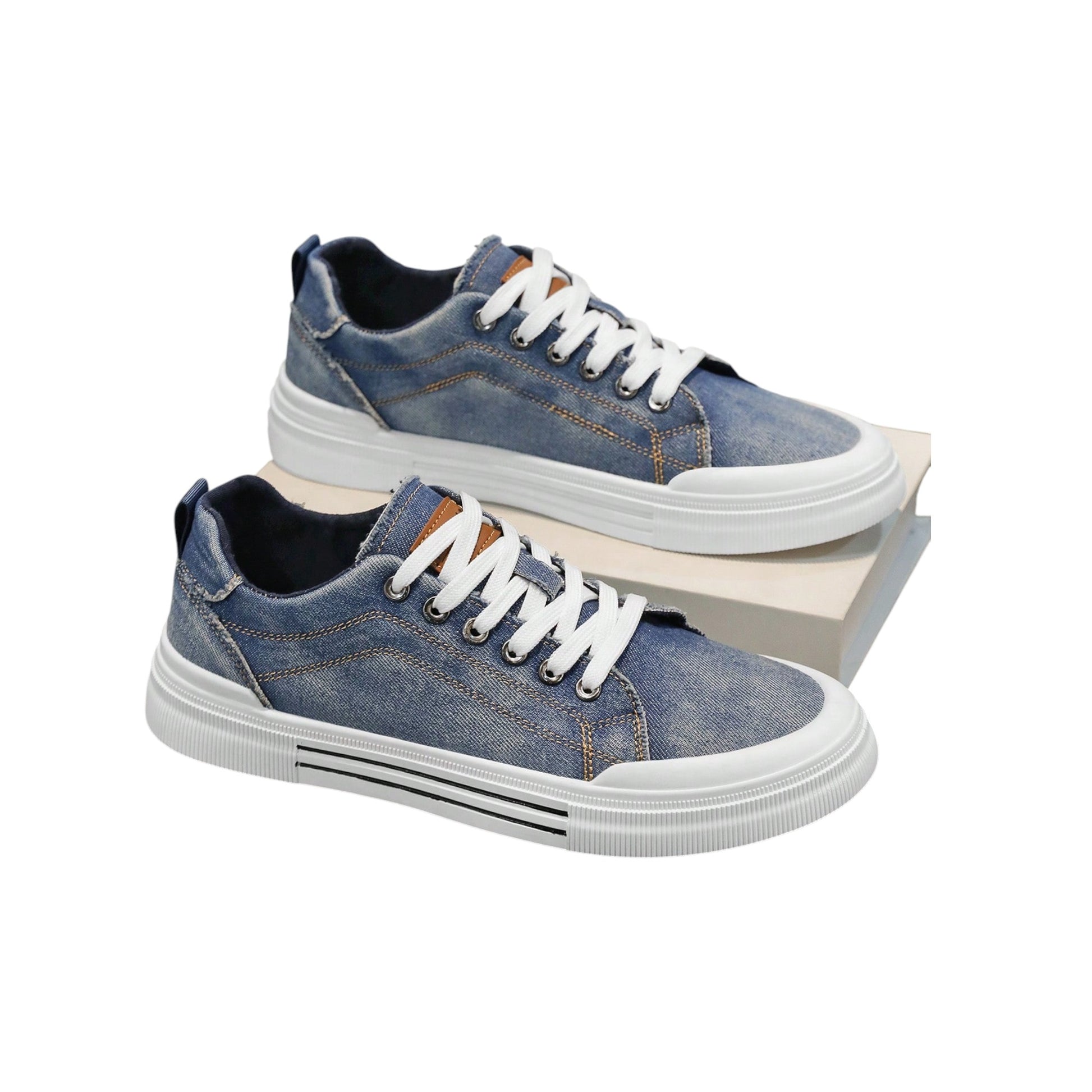 Címke nélküli, kék, farmer anyagú, fűzős sportcipő, vastag fehér talppal. Belső talp hossz: 28cm