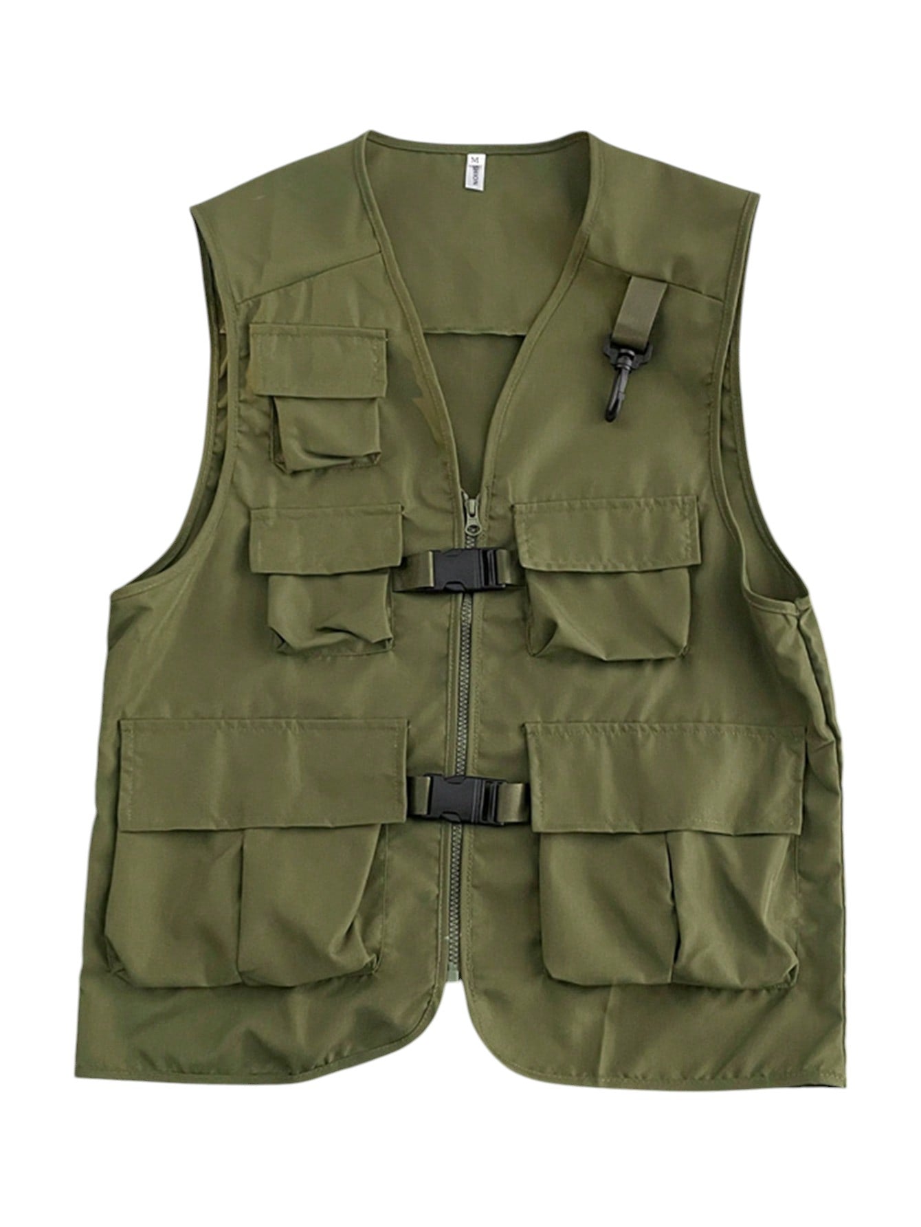 Címke nélküli, olívazöld, V-nyakú, cipzáras és csatos záródású, többzsebes mellény