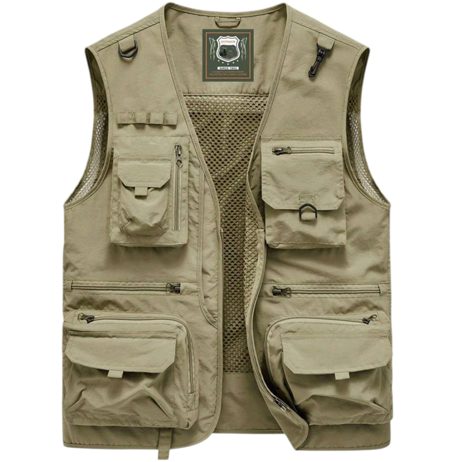 Címke nélküli, khaki, több zsebes, hálós hátú, cipzáras záródású mellény.