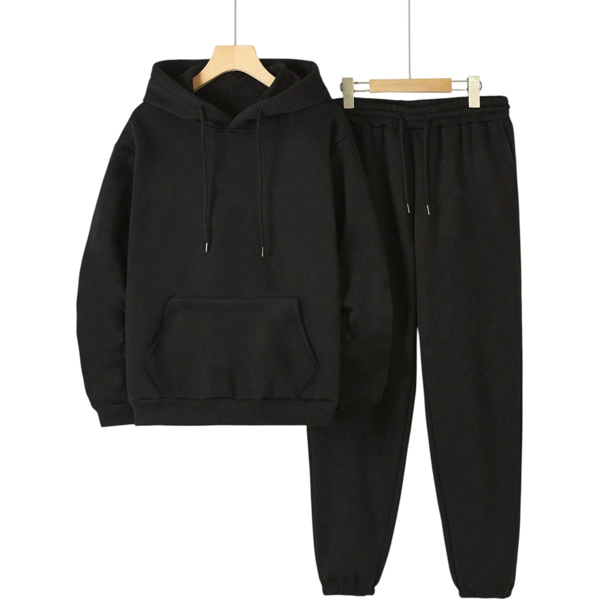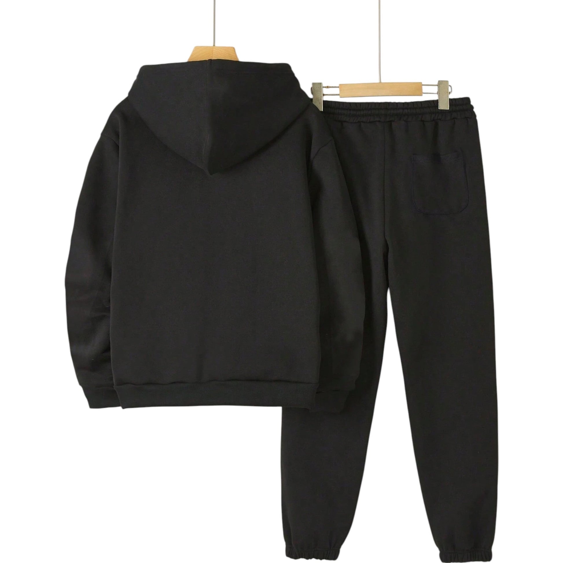 Címke nélküli, fekete színű, kapucnis pulóverből és hosszú nadrágból álló szett. Kényelmes és sportos viselet.